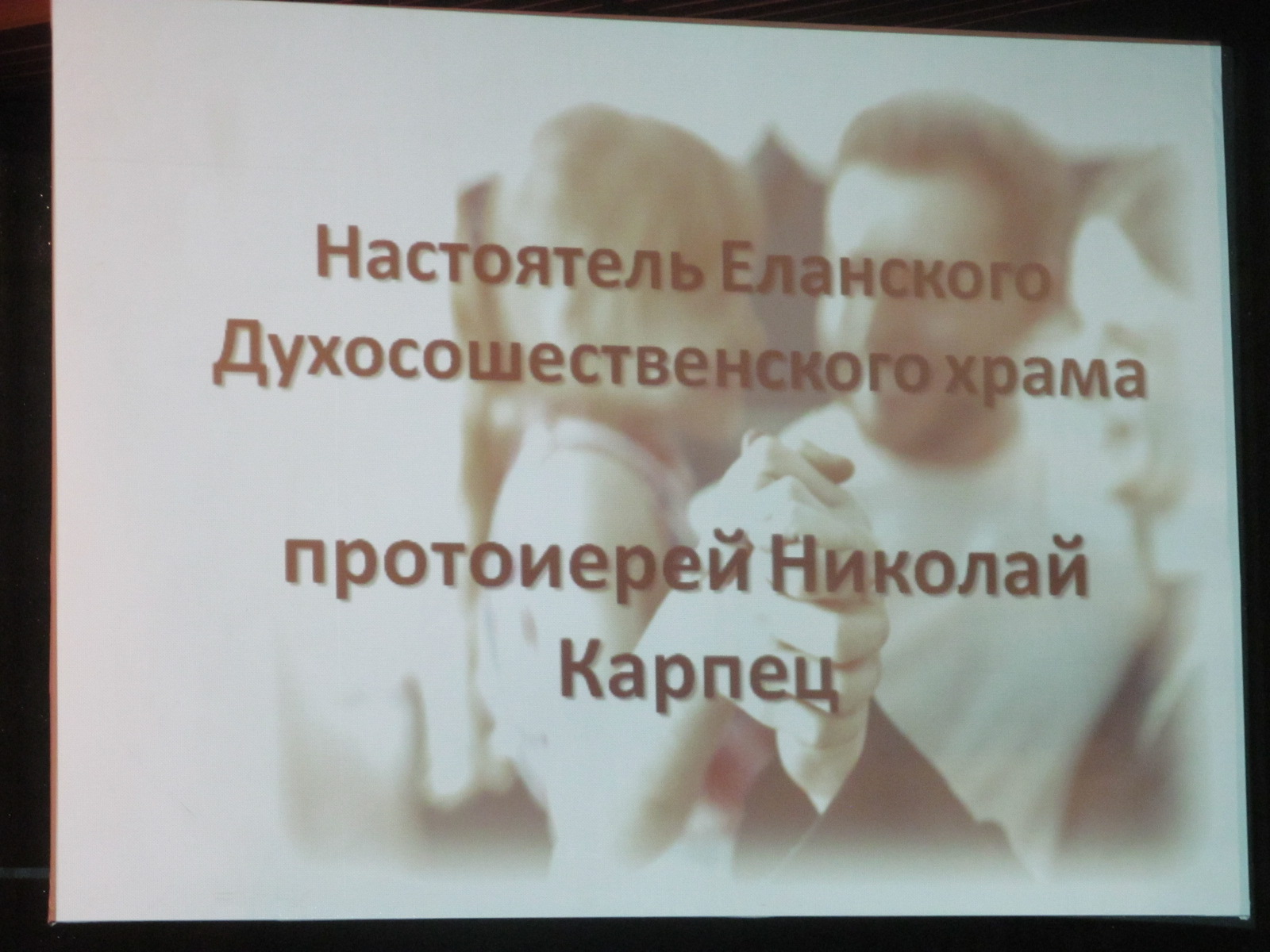По приглашению главы районной администрации Литвинова Д.Ф. на собрании выступил настоятель еланского храма Сошествия Святого Духа протоиерей Николай Карпец. В свой речи он обозначил чёткий образ христианской жизни, зачем рождаем детей, подчеркнув, что цель жизни – быть примером для детей. Говорил он и о том, как важно избегать жестокости, в первую очередь, детоубийства, грубости, насилия; решать любовью и справедливостью все житейские проблемы не только семьи, но и касающиеся детей; проявлять любовь к Господу Богу, Церкви, своей семье; формировать у детей правильный взгляд на современный мир, культуру, средства массовой информации. В заключение священник пожелал всем Божьего благословения, чтобы дети возрастали на радость родителям и во славу Божью.